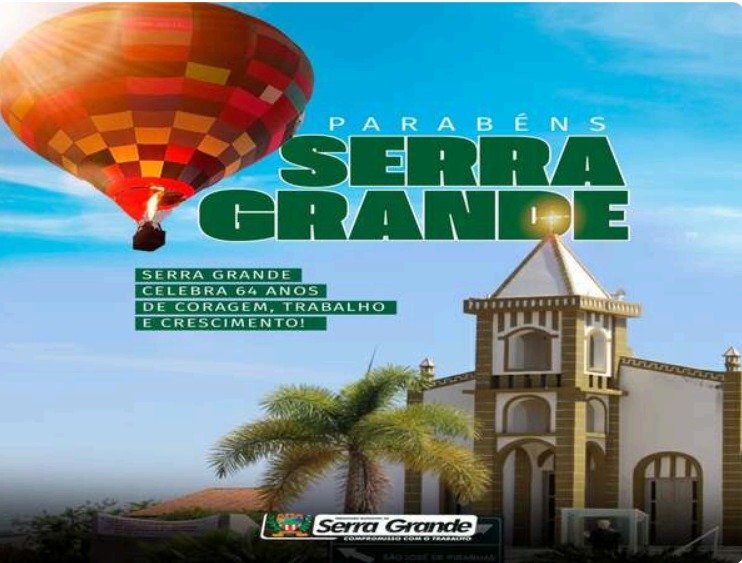 O município de Serra Grande comemora 64 anos de emancipação política e progresso, com orgulho pelas raízes e otimismo pelo futuro. A mensagem oficial destaca coragem, trabalho, crescimento e união como forças do desenvolvimento local.A publicação reforça o compromisso com o bem-estar da população e deseja prosperidade para todos.