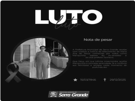 A Prefeitura Municipal de Serra Grande manifesta profundo pesar pelo falecimento de Maria Ana de Jesus, conhecida como Mariquinha, esposa do ex-vereador e ex-vice-prefeito Tonheiro. A nota relembra sua trajetória e expressa solidariedade à família, pedindo conforto e serenidade neste momento de dor.